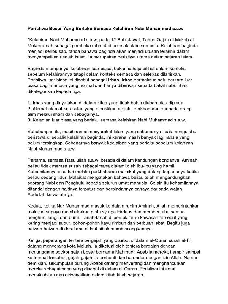 Tasik sava atau semenajung suci bagi masyarakat persia. Nabi dan rasul terakhir allah. Peristiwa kelahiran nabi muhammad saw cari padanan. 5.1.2 menganalisis keistimewaan peristiwa yang membuktikan kelahiran seorang nabi. Peristiwa selepas kelahiran nabi muhammad saw (kisah penyusuan nabi) padankan.