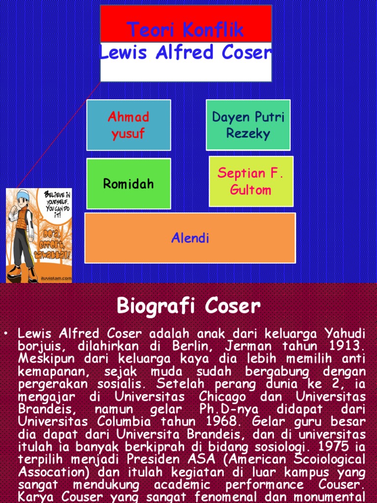 Para penganut teori konflik diantaranya: Akar dari terciptanya konflik dalam masyarakat adalah ketidakmerataan distribusi kekuasaan dan kekayaan yang menciptakan kesenjangan kelas sosial. Teori konflik menurut perspektif coser merupakan sebuah sistem sosial yang bersifat fungsional. Wahid nur tualeka dalam makalah teori konflik. Coser, dan ralf dahrendorf ini menilai, konlik muncul dengan sifat yang lebih kompleks.